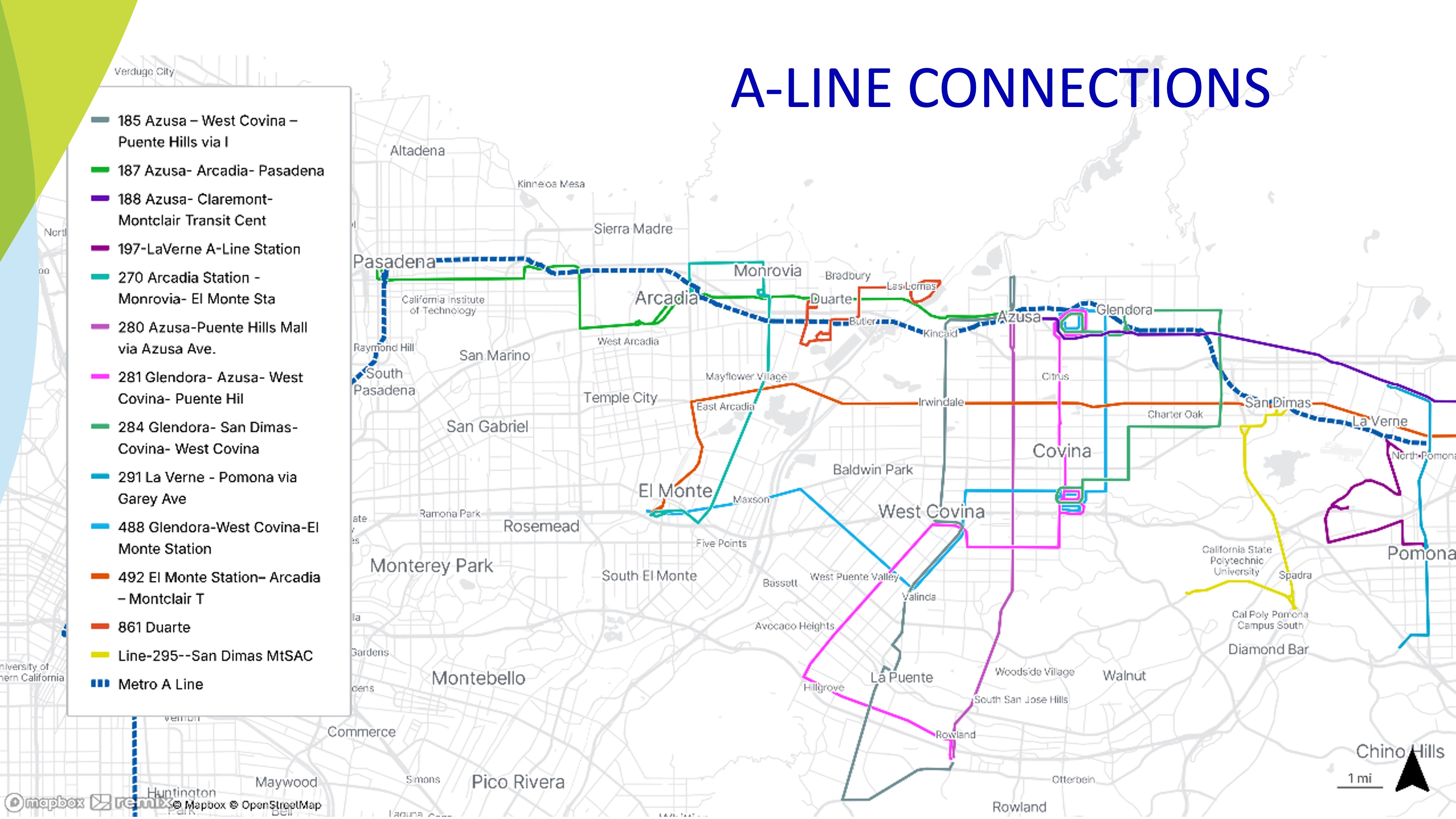 Como se ve en el gráfico de arriba (haga clic aquí Para ampliar, Foothill Transit opera varias líneas de autobús que conectan las estaciones de la Línea A del Metro (incluidas las nuevas estaciones de Glendora a Pomona) con destinos en los valles de San Gabriel y Pomona. Si tiene alguna pregunta sobre los servicios de Foothill Transit, visite https://www.foothilltransit.org/, llame al 1-800-RIDE-INFO (1-800-743-3463) o envíe un correo electrónico comentario@foothilltransit.org.